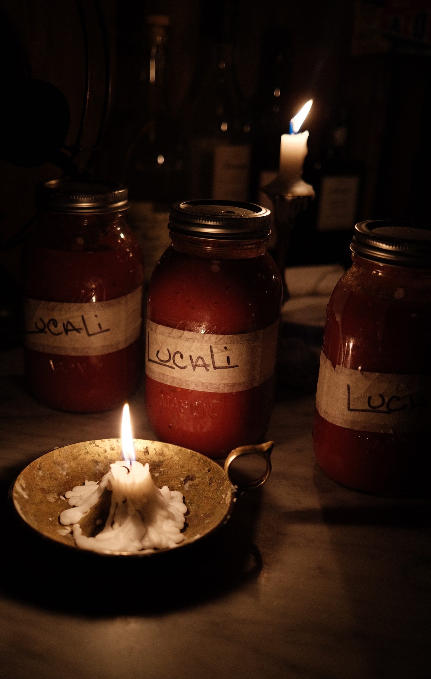 The room is perfectly quirky, like a neighborhood restaurant on the outskirts of Rome. There’s some tacky decor that looks like someone did a speed run through an antique store. The speakers are bumping oldies tunes that you’ll surely recognize. Other things feel so calculated: The room is perfectly dim. The jars of sauce with strips of tape reading “Lucali” affixed are all facing outward, glowing under flickering candlelight. The green and brown striped awning is kept in pristine condition, helping to maintain a low-profile feeling, even though the operation is an undeniable scene.