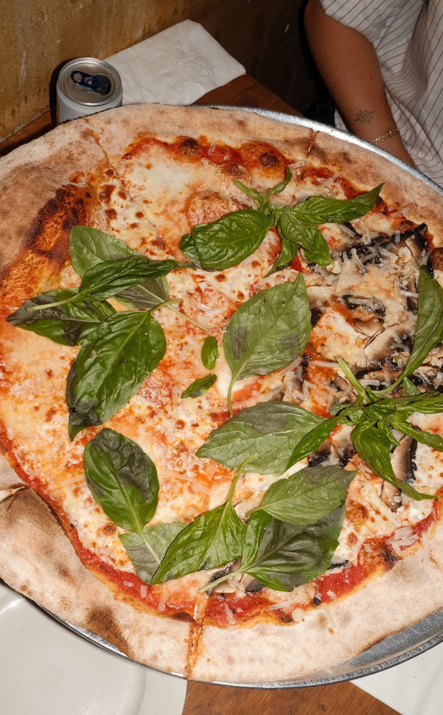 The crust is thin and crunchy. Sauce and cheese levels are light enough not to weigh down its support system, but certainly don’t leave anything to be desired. Enormous sprigs of fresh basil will sit at the center of your pie, regardless of what you order, for you to tear at and sprinkle on each slice.