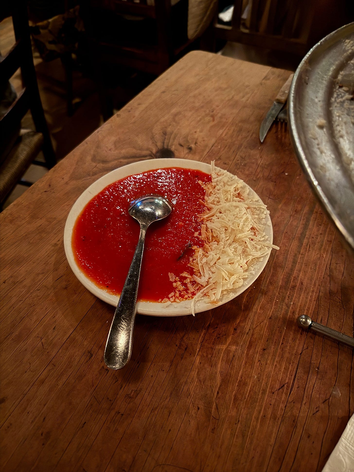 OW: For example: three items on the menu, but there is no menu. There’s a special pasta, a pie (one size), and a calzone (two sizes). The server will recite the list of available toppings tableside — if you miss an ingredient she’s rattled off, you’re not getting a repeat. They’ll ask if you’re ready to order as soon as they’ve finished telling you what’s on the menu. In most restaurants, that seems solidly against the rules. Here, a guest who has been before will have an answer before anyone has visited their table at all.