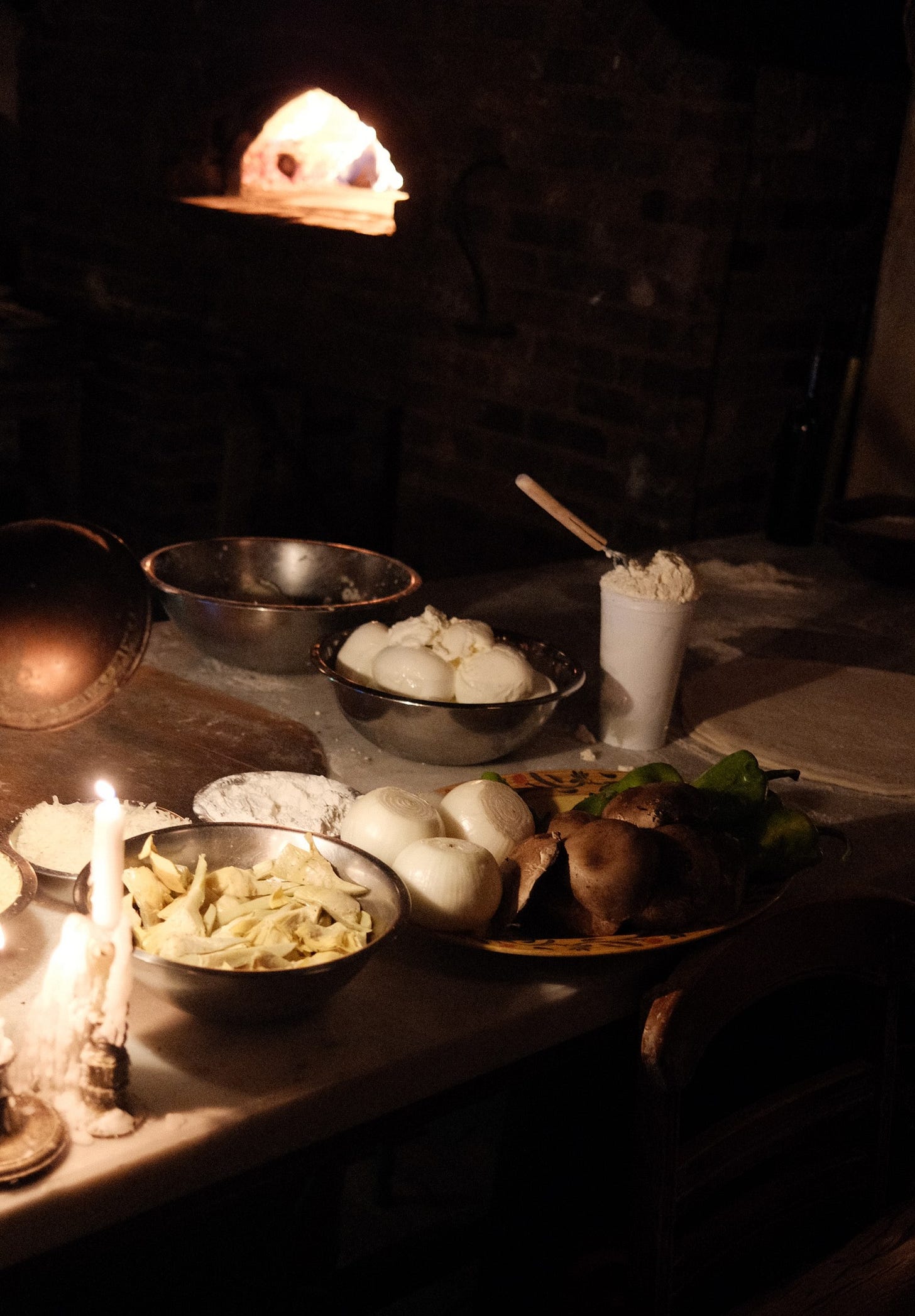 Facing the kitchen, though, you can see that the best parts of Lucali are the things you just might miss. The kitchen houses two men, barely concealed by a counter, who are slinging dough around all night. They’ll smile at you every time you make eye contact, as if to say “watch this” as they roll out pizza dough with empty wine bottles. A bowl of raw vegetables sits in front of them, an indicator that a humble bell pepper or head of garlic could be the very thing that makes your dinner memorable.