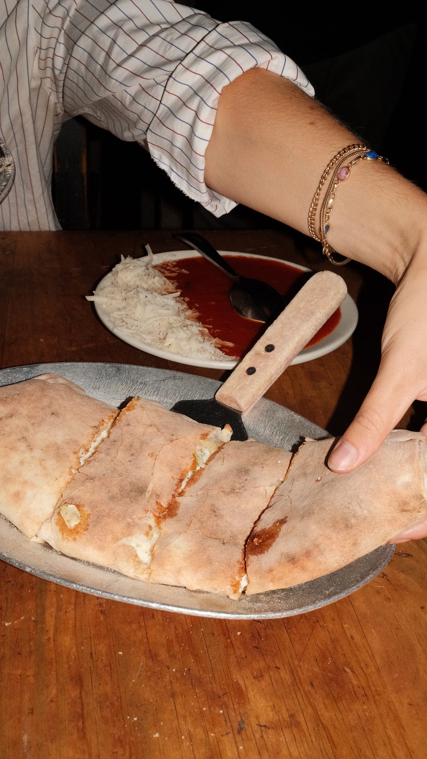 OW: The calzone seems like the most skippable of the three-item menu — a dish that hearkens back to my middle school days at the suburban, inedibly greasy pizza shop I loved, where all I ever wanted was an enormous, cheesy calzone. Since becoming a legal adult, and certainly since moving to New York, procuring a calzone has never once crossed my mind.