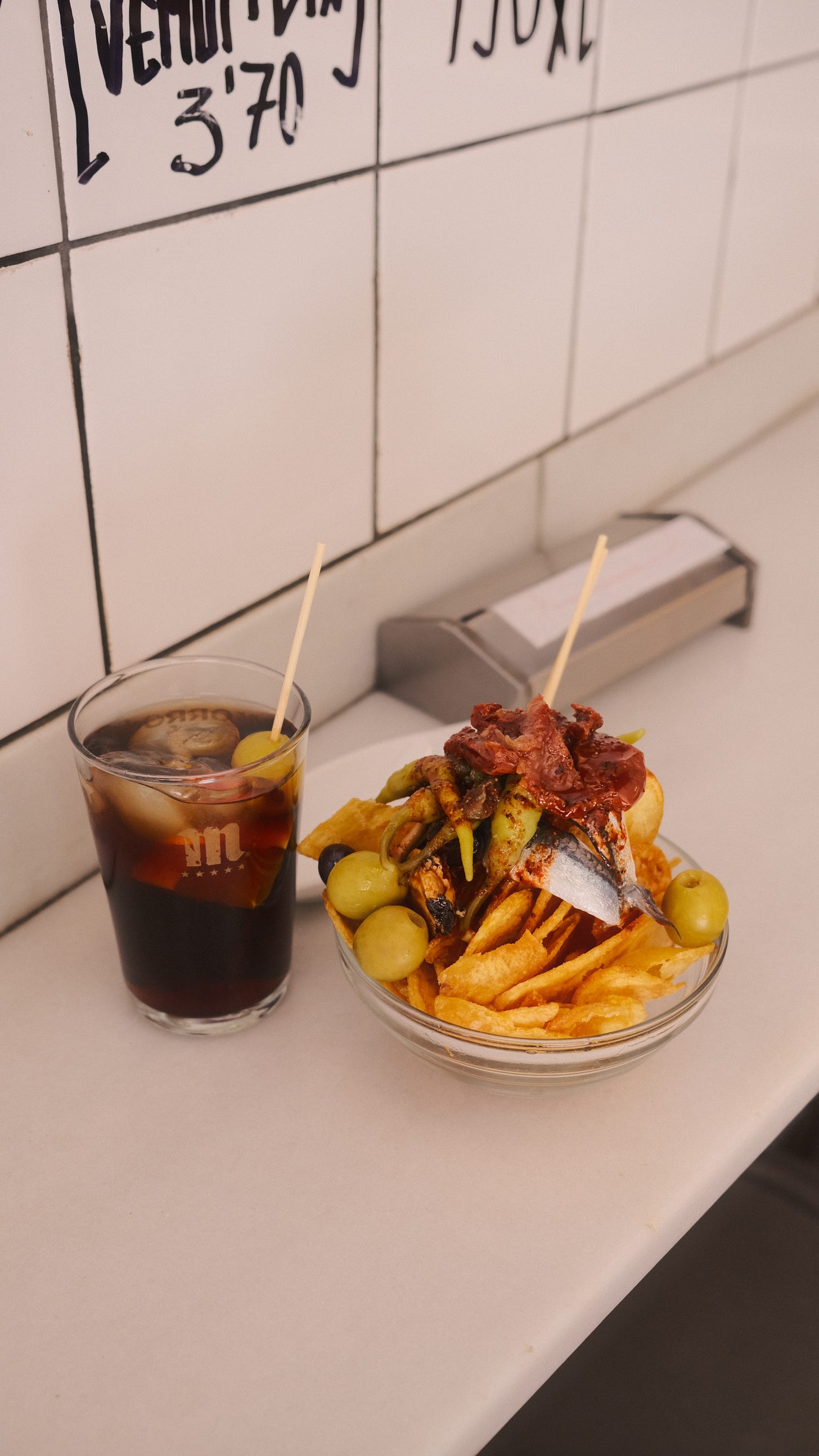 When the 2:00 pm church bells ring in Barcelona, it is time for vermouth. I don’t make the rules, I abide by them. There’s no better place to sip a glass of house red than Morro Fi. To be honest, I don’t even know what else they serve. Just the “house special,” which is a package deal of vermouth on the rocks and a mountain of potato chips layered with boquerones, olives, pickled mussels, and spicy piparra chili peppers. Spanish happy meal kinda vibe. It’s truly hits all the desired flavor and texture notes — crunchy, salty, briny, and even just a little spicy. Plus there’s a little lo-fi on the speaker system at a conversational volume. What a life.
