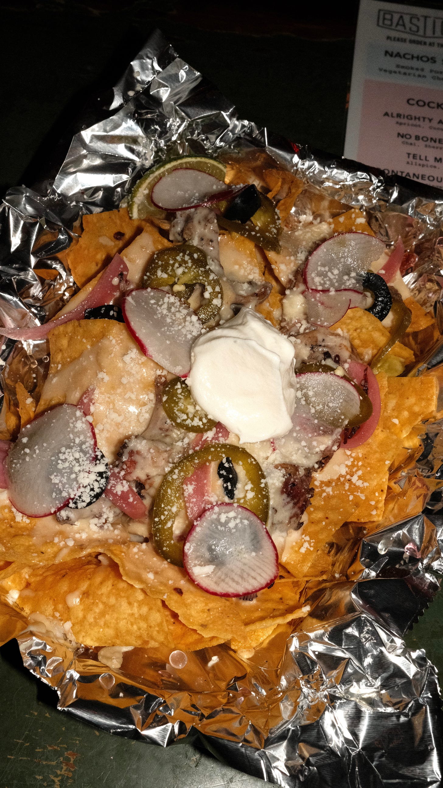 If you do some quick recon, you’ll find Bastion is most certainly not a bar, but rather an upscale 24-seat tasting menu spot in a warehousey district of Nashville. However, their massive front room, aptly named “The Big Bar,” is a casual, walk-in-only hang. The drinks are great, the staff is loose, and the lone snack offering of fully-loaded nachos is a killer one. Salty chips are set in foil-lined paper basket, layered with a tomatillo salsa and warm queso, piled with smoked pork shoulder, garnished with radish and jalapeno. Every component is well-executed, no corners cut, and no bites with just chips.