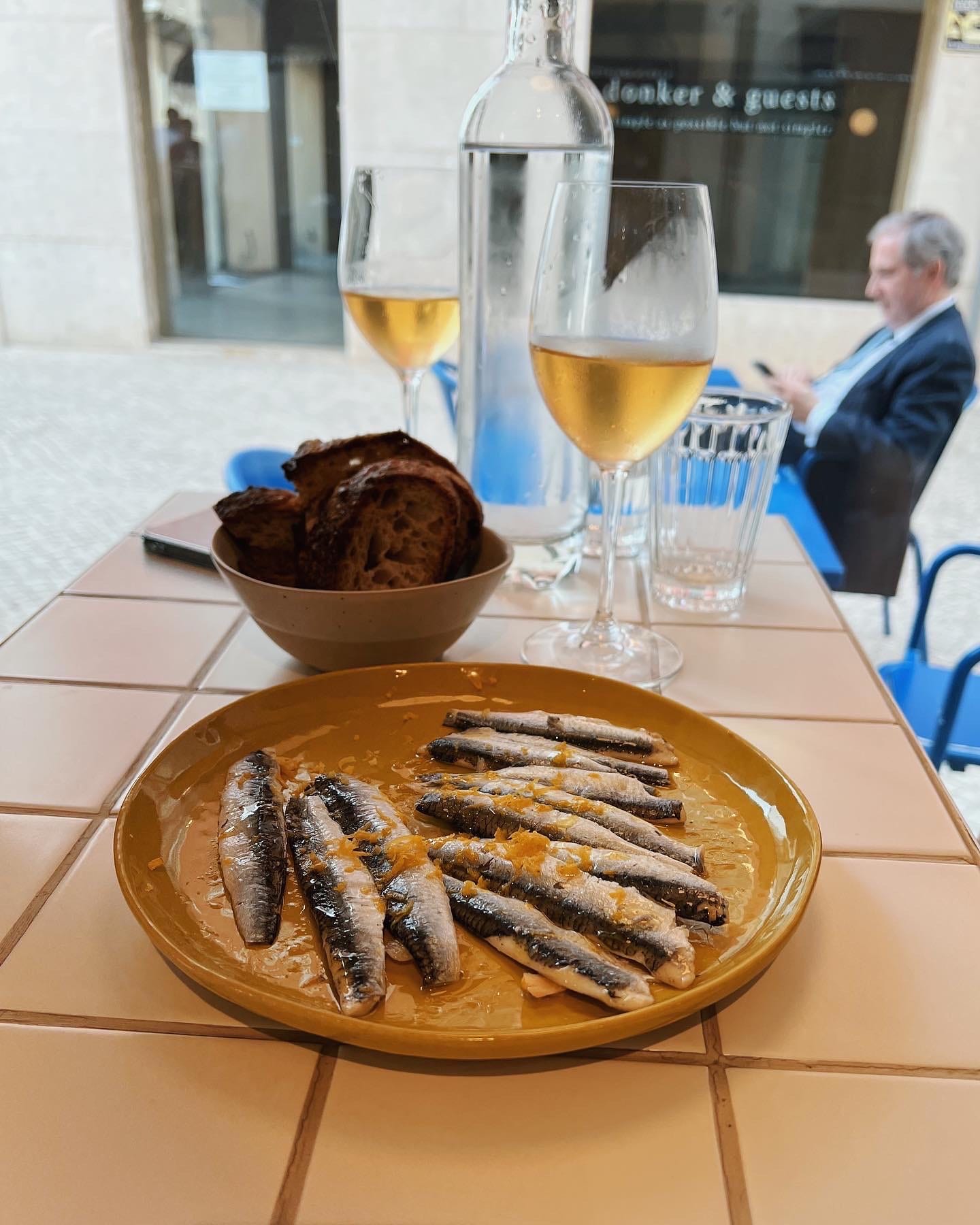 There are a few perfect scenes I’ve encountered in life: A table for 6 at Contramar in Mexico City; ham & cheese sandwiches at Glacier National Park on a Sunday afternoon. Another easy addition to the list is aperitivo hour at Comida Independente in Lisbon. This table setting — a glass of crisp, cold orange wine and a plate of fresh, meaty sardines doctored up with high-quality olive oil and a zesting of lemon — is something I long for. A basket of crusty sourdough doesn’t need to be ordered, it just comes alongside. Again — perfect scenes.