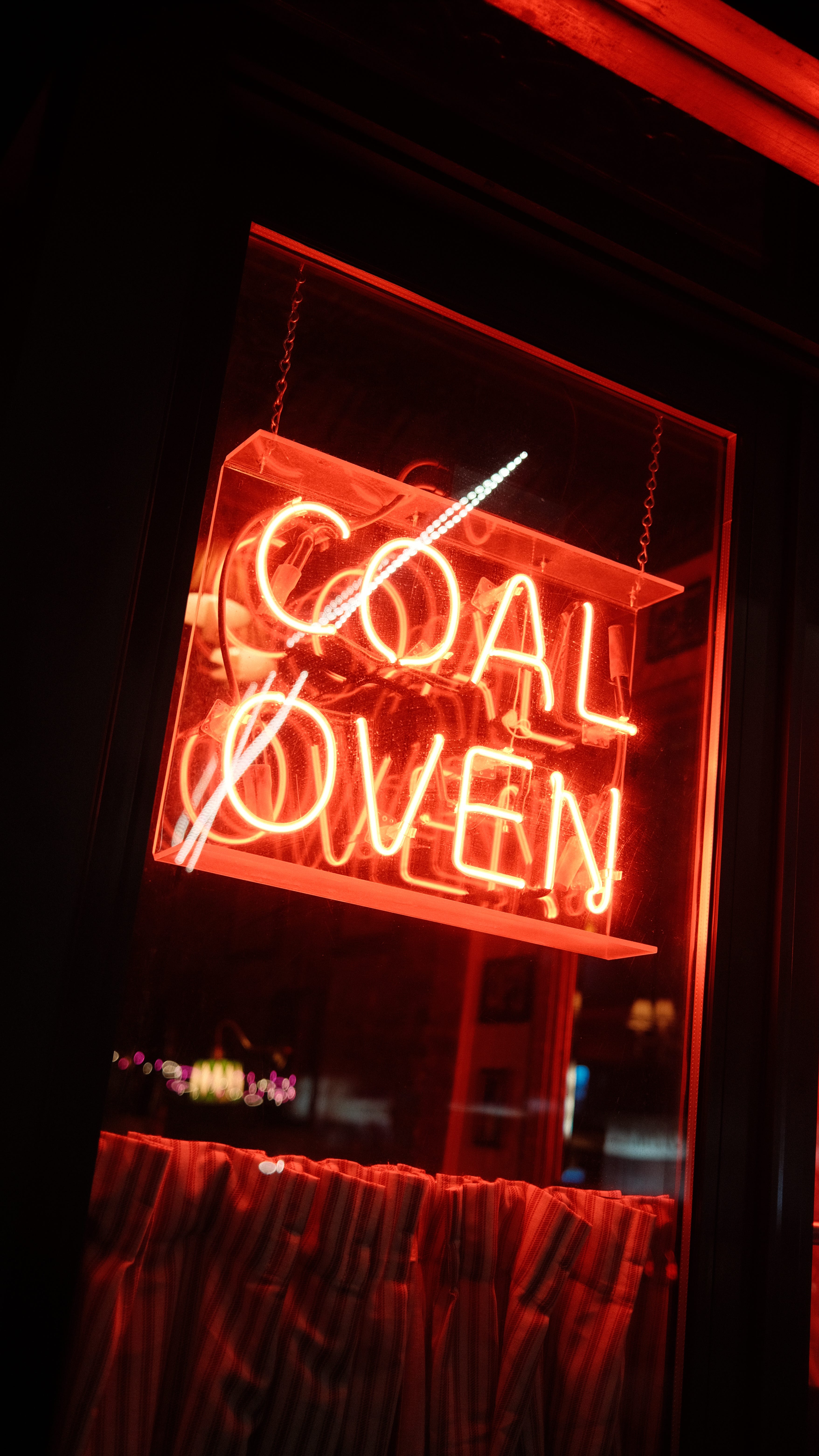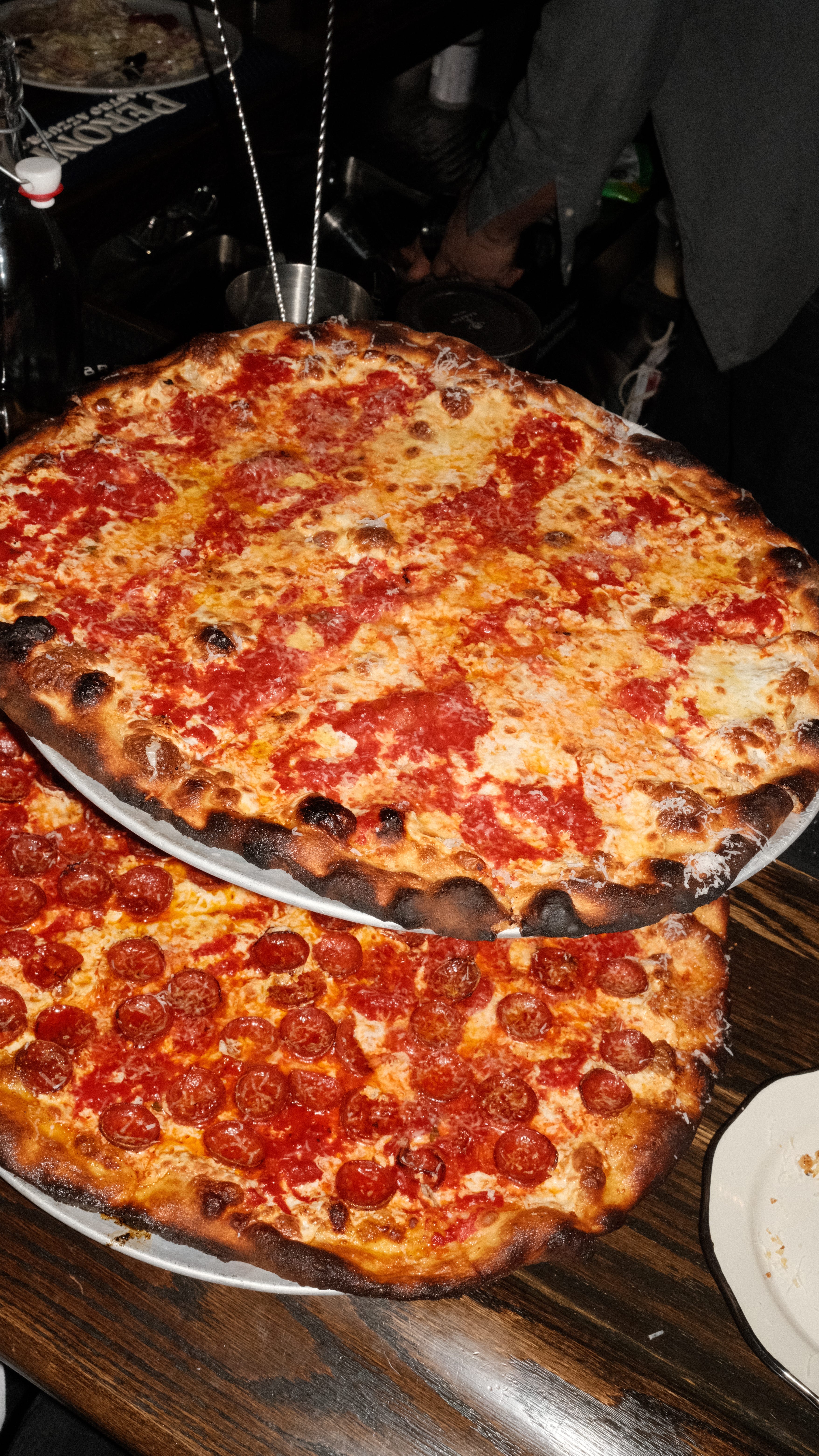 By the time the front door swung open at 5:00 pm, a small crowd had formed outside the restaurant — everyone in a light dusting of sleet, hankering for pies. Some were regulars, visibly worried their neighborhood spot was getting busier. Others, like me, were filled with anticipation about the pizzas to come. Minutes later, we were ushered into the dining room — illuminated by the hazy red neon glow, with the faint smell of charcoal in the air — and suddenly, the journey felt worthwhile.